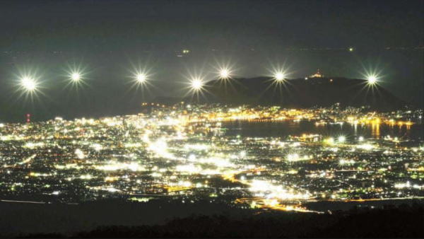 裏夜景と言われる函館山(右端は五稜郭タワー) |