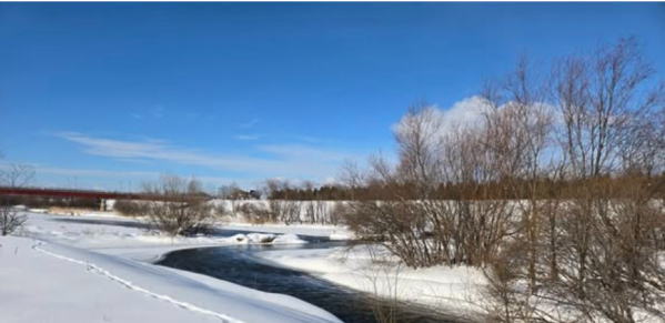 久し振りに永山新川の河川敷をスノーシューで散歩しました。今年は、旭川は雪が少なくその代り寒い日が続いています。永山新川も氷が張り、川の上を歩けるほどの厚さになっています。川の真ん中からの景色も面白いものです。 |